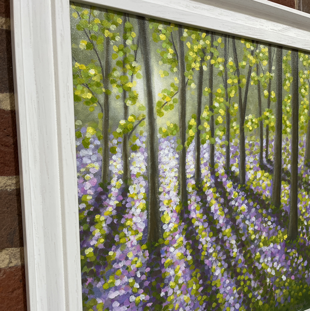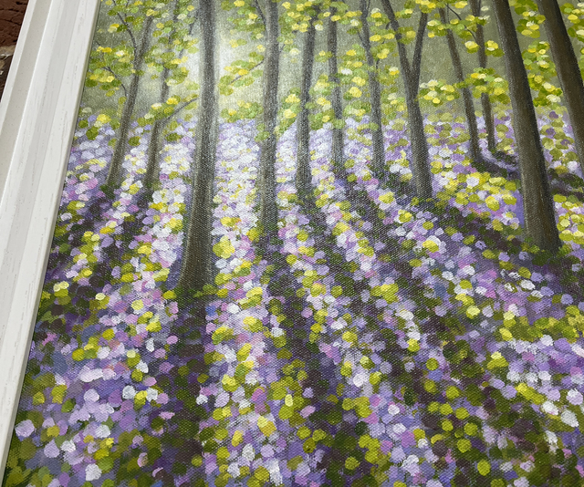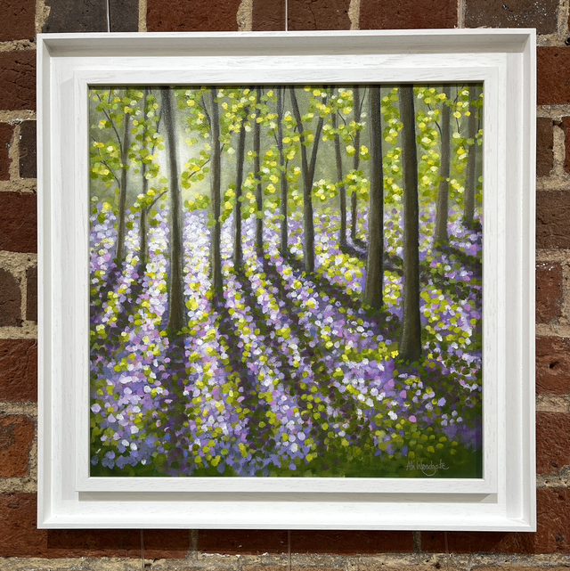 A stunning painting of a the bluebell woods at Pamphill in Dorset. Sunlight through the trees gives this a lovely feeling.