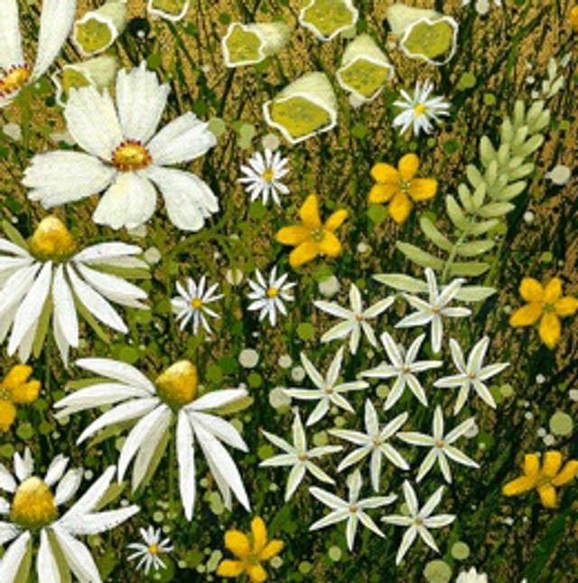 A gorgeous fine art print. Varying shades of white flowers on a gold background with a bumble bee.