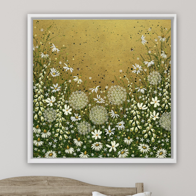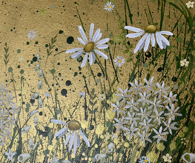 A beautiful original acrylic painting featuring a multitude of white flowers with bees. The golden background gives a lovely glow.