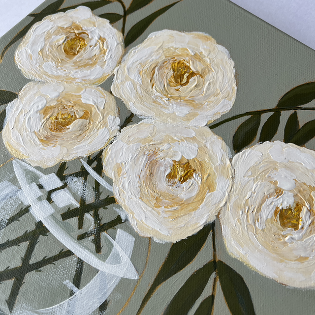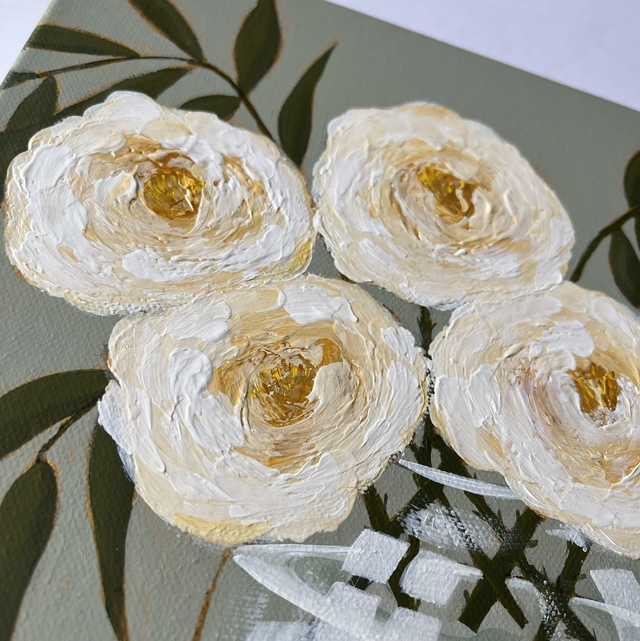 A beautiful 25cm square framed box canvas painting of creamy roses and eucalyptus on a background of an acrylic paint which I have mixed to be a similar match to F&B “mizzle.” Some pretty golden highlights showing through.