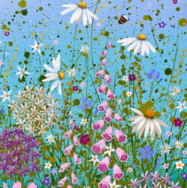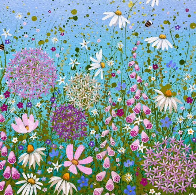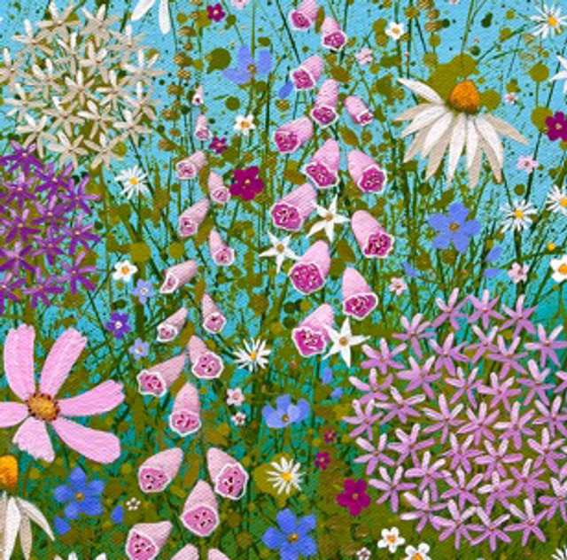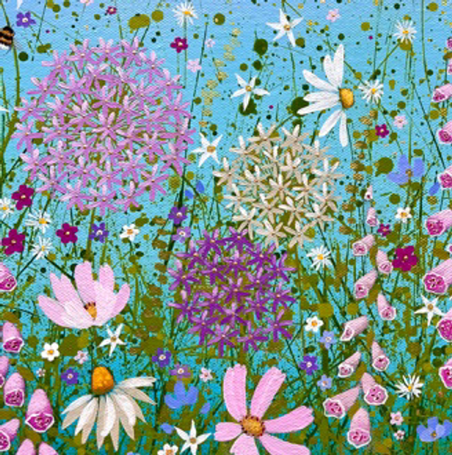 A detailed fine art print which is hand finished by the artist. Features lots of different flowers such as alliums, daisies, foxgloves on a blue background.