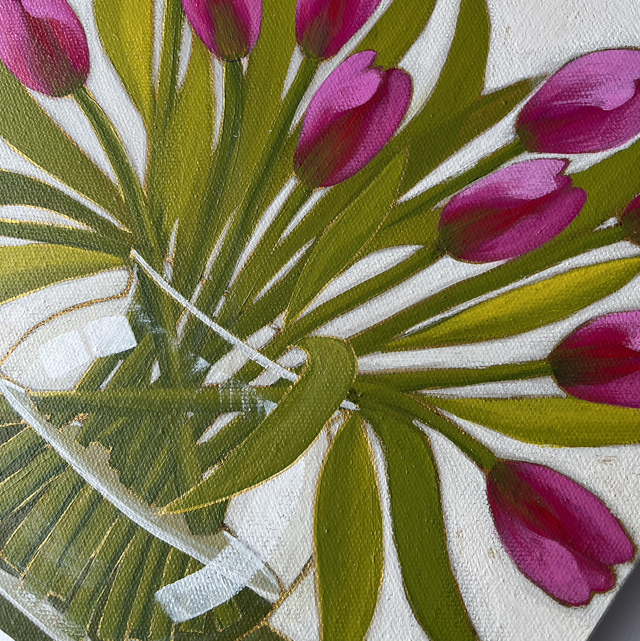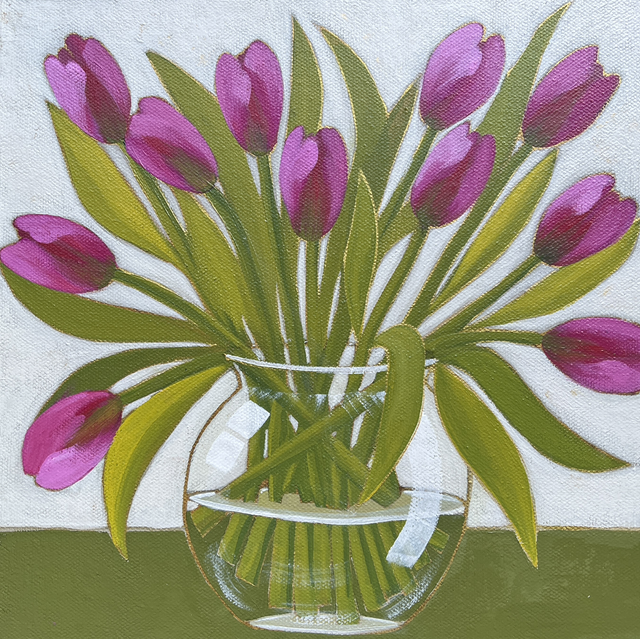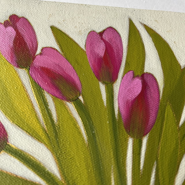 A 25cm square painting on a box canvas. Bright pink tulips in a vase.