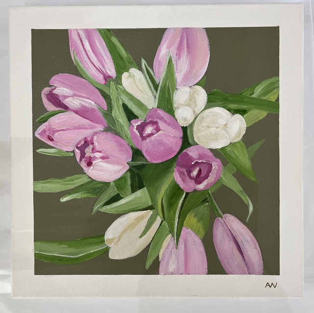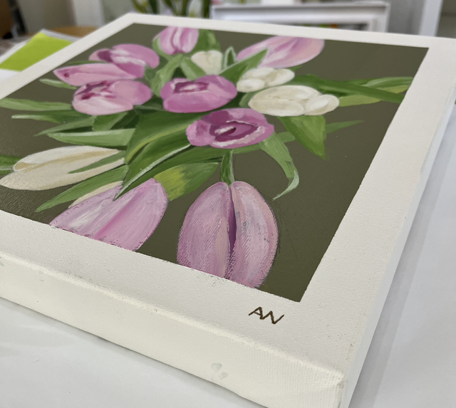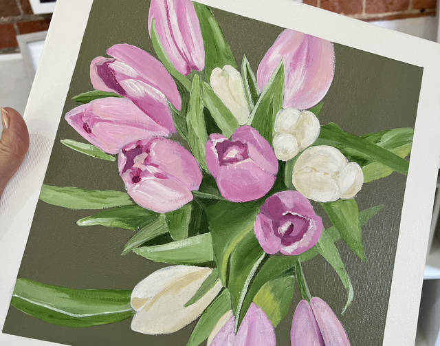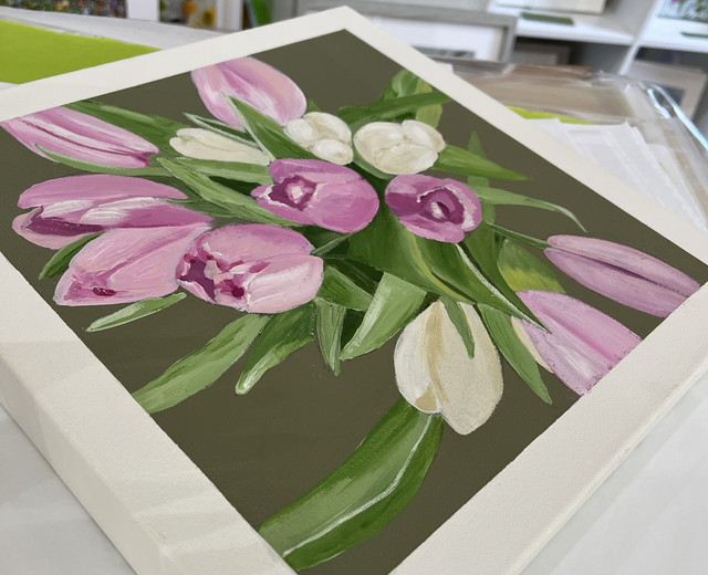 A painting from a few years ago. This study of a bouquet of mixed tulips with a grey green background is painted on a deep edge canvas with a taped edge to reveal a white border around the painting.