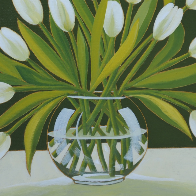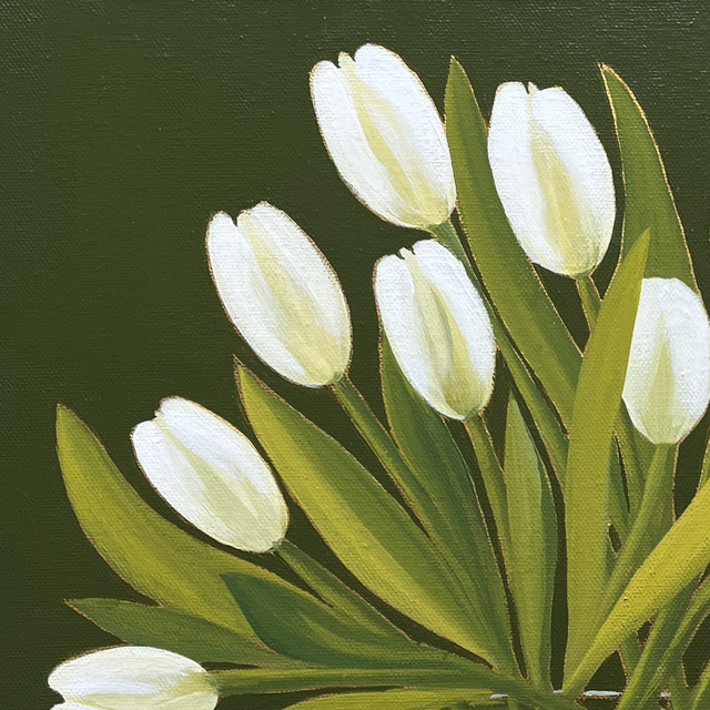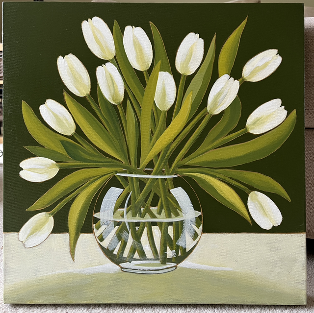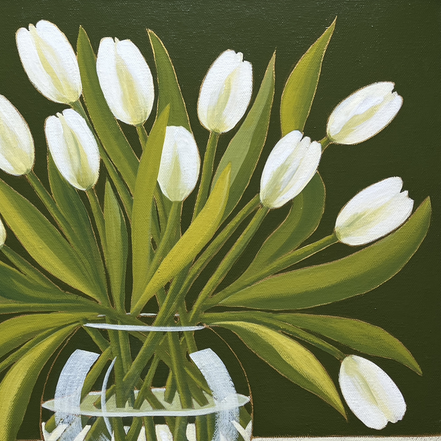 A 40 cm x 40 cm square canvas original painting of white tulips on a green background. Professionally framed.